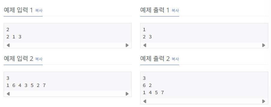 왼쪽 그림에 나와있는 마을이라면, 상근이는 2-1-3 순서대로 빌딩을 들어갔을 것이고, 오른쪽 그림의 경우에는 1-6-4-3-5-2-7 순서로 들어갔을 것이다. 상근이가 종이에 적은 순서가 모두 주어졌을 때, 각 레벨에 있는 빌딩의 번호를 구하는 프로그램을 작성하시오.