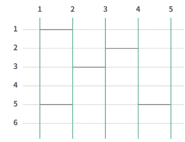 위의 그림에는 가로선이 총 5개 있다. 가로선은 위의 그림과 같이 인접한 두 세로선을 연결해야 하고, 가로선을 놓을 수 있는 위치를 연결해야 한다.