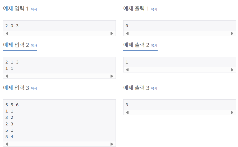 첫 번째 입력 줄에서 N M H가 주어진다.