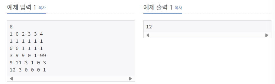 예제 입력 1을 예를 들어보면 다음과 같이 12가 최소가 되는 것이다.