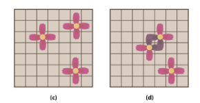 그림(c)는 세 꽃이 정상적으로 핀 모양이고 그림(d)는 두 꽃이 죽어버린 모양이다.