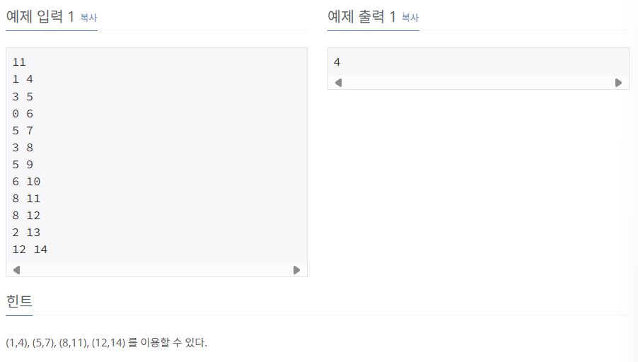 한 개의 회의실이 있는데 이를 사용하고자 하는 N개의 회의에 대하여 회의실 사용표를 만들려고 한다. 각 회의 I에 대해 시작시간과 끝나는 시간이 주어져 있고, 각 회의가 겹치지 않게 하면서 회의실을 사용할 수 있는 회의의 최대 개수를 찾아보자. 단, 회의는 한번 시작하면 중간에 중단될 수 없으며 한 회의가 끝나는 것과 동시에 다음 회의가 시작될 수 있다. 회의의 시작시간과 끝나는 시간이 같을 수도 있다. 이 경우에는 시작하자마자 끝나는 것으로 생각하면 된다.