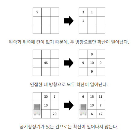 - 인접한 방향에 공기청정기가 있거나, 칸이 없으면 그 방향으로는 확산이 일어나지 않는다.