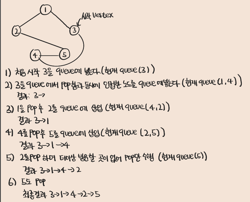 pop하여 이를 출력하고 그 인접한 노드들을 위 그림과 같이 queue에 넣어주면 된다.