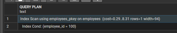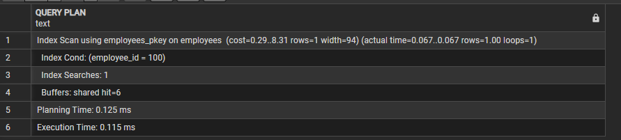 실행 결과를 확인하면 employees_pkey 인덱스를 사용한 Index Scan이 수행된 것을 확인할 수 있다.