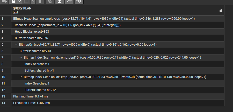 실행계획을 확인한 결과, 해당 쿼리는 employees 테이블에 대해 Seq Scan(순차 스캔) 방식으로 수행되었다. 이는 department_id = 10 OR job_id IN (3, 4, 5) 조건이 서로 다른 컬럼에 대한 OR 조건으로 구성되어 있어, 개별 인덱스가 존재하더라도 PostgreSQL이 이를 효율적으로 결합하여 활용하기 어렵기 때문이다.