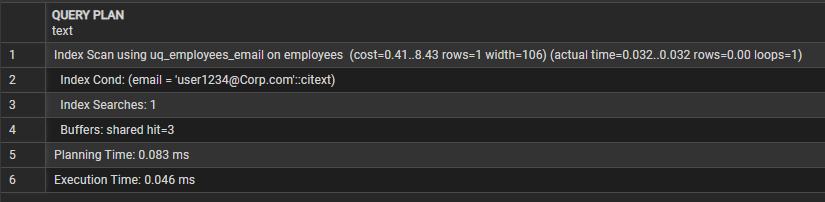 citext 적용 이후 동일한 조건의 조회 쿼리를 실행한 결과, lower() 함수 없이도 대소문자를 무시한 비교가 가능해졌으며, 실행계획은 uq_employees_email 인덱스를 활용한 Index Scan 방식으로 수행되었다. 또한 인덱스 탐색 1회로 바로 단건 조회가 이루어지면서,