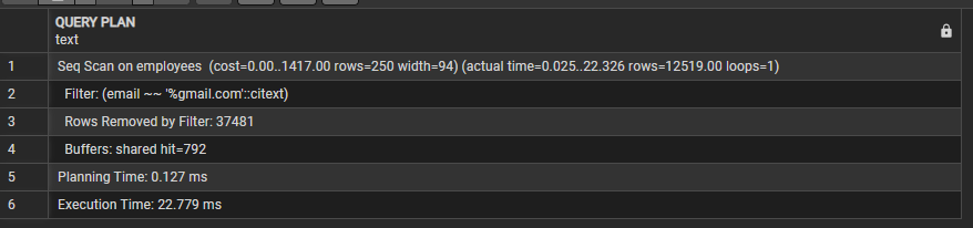 실행계획을 확인한 결과, 해당 쿼리는 employees 테이블에 대해 Seq Scan(순차 스캔) 방식으로 수행되었다. 이는 email LIKE '%gmail.com' 조건이 문자열 앞부분에 와일드카드(%)를 포함하는 접미사 검색이기 때문에, 일반적인 B-Tree 인덱스를 활용할 수 없기 때문이다. 그 결과 테이블의 전체 데이터를 순차적으로 탐색한 뒤 조건에 맞지 않는 다수의 행이 필터링되었으며(Rows Removed by Filter: 37481), 전체 실행 시간은 약 22.779ms로 비교적 크게 나타났다.