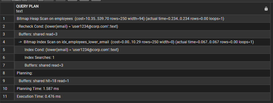 idx_employees_lower_email 인덱스를 사용하는 Bitmap Index Scan 방식으로 실행되었다.