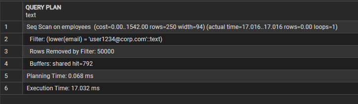 필터 조건으로 lower(email) = 'user1234@corp.com'이 적용되어 전체 50,000건을 거의 다 읽은 뒤 조건에 맞지 않는 행을 제거한 것을 확인할 수 있다(Rows Removed by Filter: 50000).