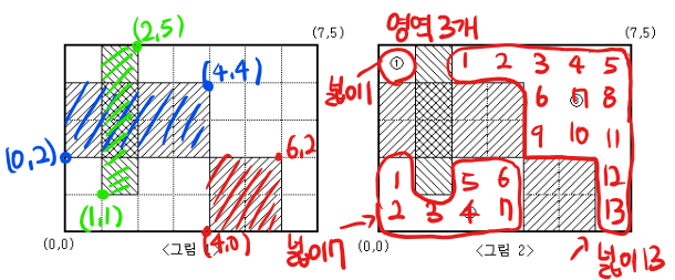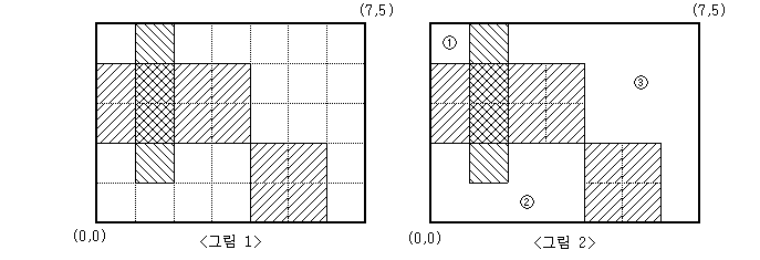 예를 들어 M=5, N=7 인 모눈종이 위에 <그림 1>과 같이 직사각형 3개를 그렸다면, 그 나머지 영역은 <그림 2>와 같이 3개의 분리된 영역으로 나누어지게 된다.