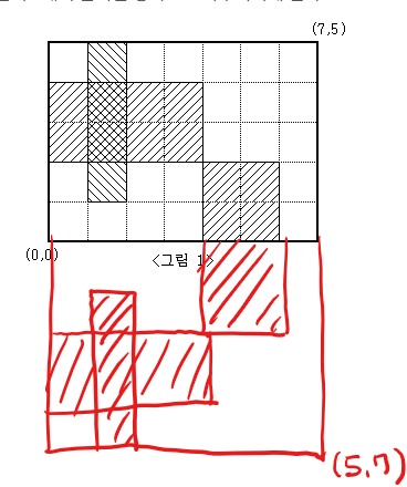 이후 K개의 직사각형 좌표를 입력받아 해당 영역을 1로 표시한다. 이는 색칠된 부분을 의미한다.