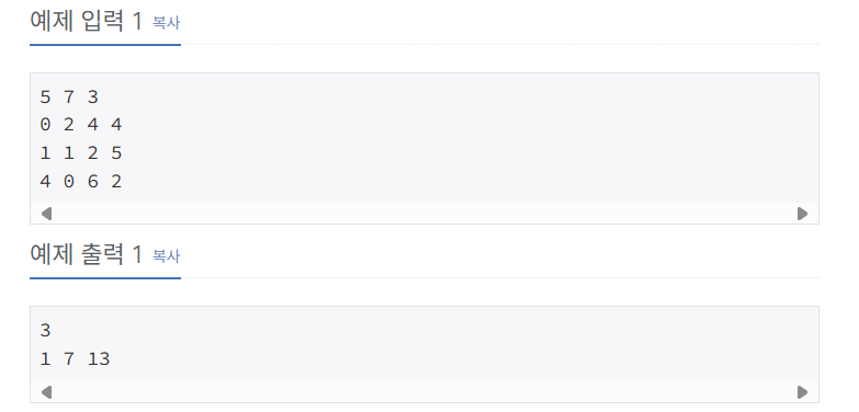 예제 입력 1을 통해 출력 결과가 3 \n 1 7 13이 되는지 알아보자