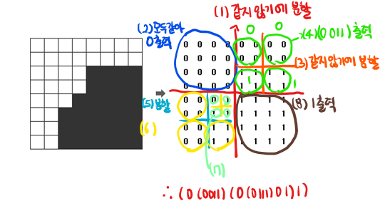 → 0과 1이 섞여 있음 → 다시 4등분 - (6) 왼쪽 아래 4분할 후 (7)2사분면은 한번더 분할이 필요하여 분할