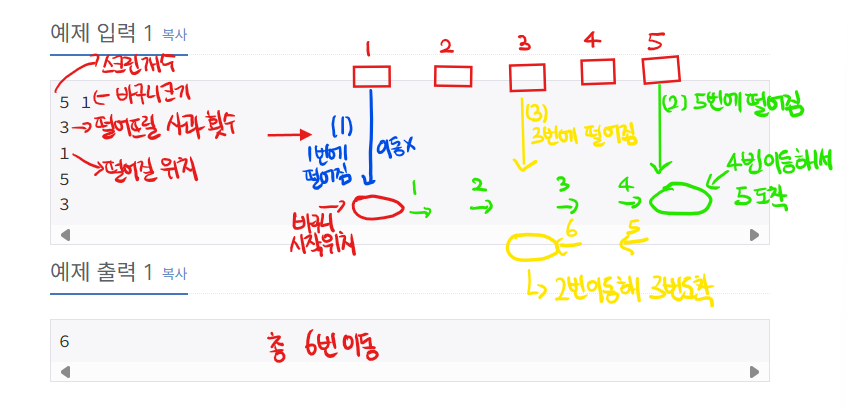 - 이전에 바구니는 5번에 있음 → 3번으로 이동하려면 2칸 이동