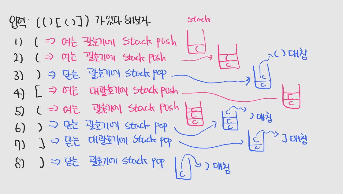 - 닫는 괄호가 등장하면 스택에서 pop을 수행한 후, 꺼낸 괄호와 현재 닫는 괄호가 쌍을 이루는지 확인한다.