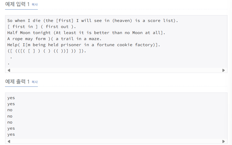 정민이의 임무는 어떤 문자열이 주어졌을 때, 괄호들의 균형이 잘 맞춰져 있는지 판단하는 프로그램을 짜는 것이다.