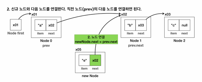 - 새 노드의 next를 이전 노드의 next로 설정하고, 이전 노드의 next를 새 노드로 연결한다.