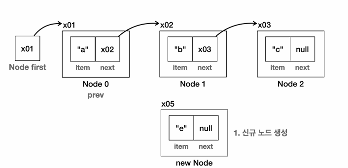 - first == null이면 새 노드를 first에 연결하고, 아니면 first부터 순회하여 마지막 노드까지 간 뒤 next에 새 노드를 연결한다.