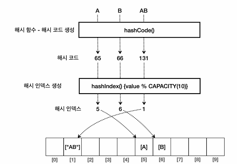 - 이 해시 코드를 해시 함수에 넣어 해시 인덱스를 구한다.