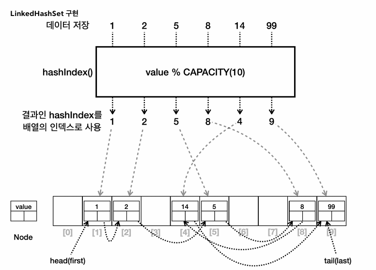LinkedHashSet은 HashSet을 확장한 구조로, 해시 기반의 저장 방식은 유지하면서도, 요소가 삽입된 순서를 기억한다. 이는 내부적으로 이중 연결 리스트(doubly-linked list)를 함께 사용하기 때문이다. 데이터를 반복하거나 출력할 때는 항상 삽입한 순서대로 나타난다.