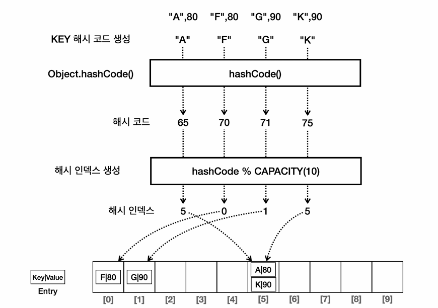 HashSet처럼 충돌이 발생할 경우 하나의 버킷에 여러 Entry가 저장되며, 자바 8부터는 일정 수 이상 충돌이 발생하면 내부 구조를 Tree로 전환해 성능을 유지한다.