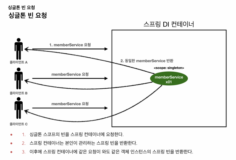 | singleton | (기본값) 컨테이너 시작~종료까지 하나의 인스턴스 유지 |