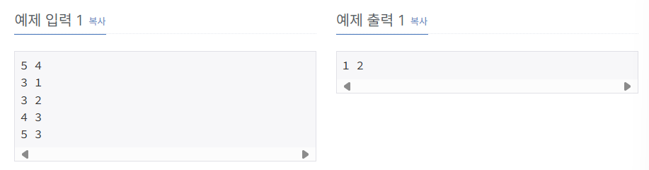 첫째 줄에, N과 M이 들어온다. N은 10,000보다 작거나 같은 자연수, M은 100,000보다 작거나 같은 자연수이다. 둘째 줄부터 M개의 줄에 신뢰하는 관계가 A B와 같은 형식으로 들어오며, "A가 B를 신뢰한다"를 의미한다. 컴퓨터는 1번부터 N번까지 번호가 하나씩 매겨져 있다.