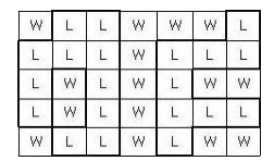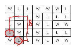 첫째 줄에는 보물 지도의 세로의 크기와 가로의 크기가 빈칸을 사이에 두고 주어진다. 이어 L과 W로 표시된 보물 지도가 아래의 예와 같이 주어지며, 각 문자 사이에는 빈 칸이 없다. 보물 지도의 가로, 세로의 크기는 각각 50이하이다.