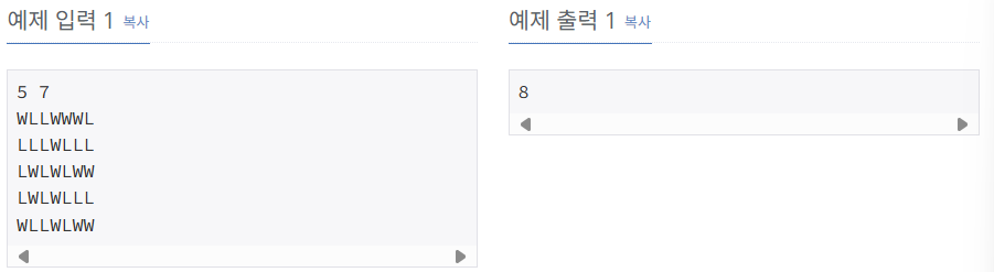 보물섬 지도를 발견한 후크 선장은 보물을 찾아나섰다. 보물섬 지도는 아래 그림과 같이 직사각형 모양이며 여러 칸으로 나뉘어져 있다. 각 칸은 육지(L)나 바다(W)로 표시되어 있다. 이 지도에서 이동은 상하좌우로 이웃한 육지로만 가능하며, 한 칸 이동하는데 한 시간이 걸린다. 보물은 서로 간에 최단 거리로 이동하는데 있어 가장 긴 시간이 걸리는 육지 두 곳에 나뉘어 묻혀있다. 육지를 나타내는 두 곳 사이를 최단 거리로 이동하려면 같은 곳을 두 번 이상 지나가거나, 멀리 돌아가서는 안 된다.