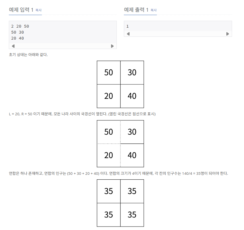 이 문제는 인접한 두 나라의 인구 차이가 L 이상 R 이하일 경우 국경을 열고, 국경이 열린 나라들을 하나의 연합으로 묶는다.