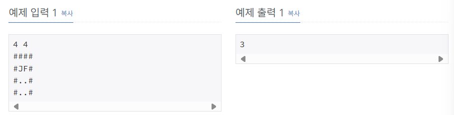 이걸 보면 (4,2)는 t=3에 불이 도착한다. 지훈이는 (2,2)→(3,2)→(4,2)로 t=2에 가장자리 칸 도착, 다음 한 걸음에 밖으로 나가니 정답 3이 된다.