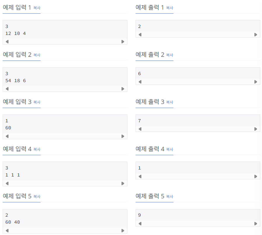 첫째 줄에 SCV의 수 N (1 ≤ N ≤ 3)이 주어진다. 둘째 줄에는 SCV N개의 체력이 주어진다. 체력은 60보다 작거나 같은 자연수이다.