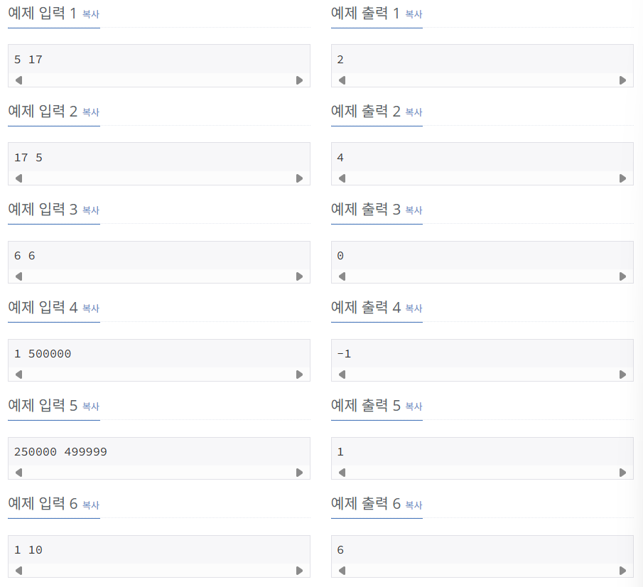 수빈이와 동생의 위치가 주어졌을 때, 수빈이가 동생을 찾을 수 있는 가장 빠른 시간이 몇 초 후인지 구하는 프로그램을 작성하시오. 동생을 찾는 위치는 정수 좌표이어야 하고, 수빈이가 0보다 작은 좌표로, 50만보다 큰 좌표로 이동하는 것은 불가능하다.