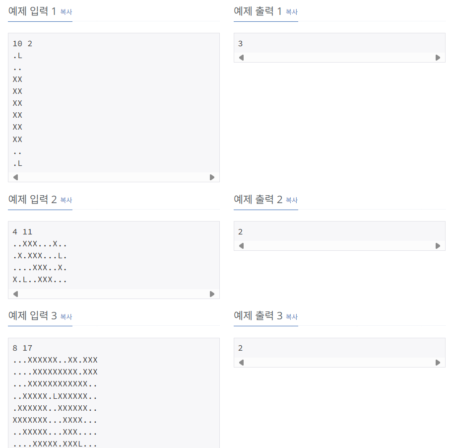 다음 R개의 줄에는 각각 길이 C의 문자열이 하나씩 주어진다. '.'은 물 공간, 'X'는 빙판 공간, 'L'은 백조가 있는 공간으로 나타낸다.