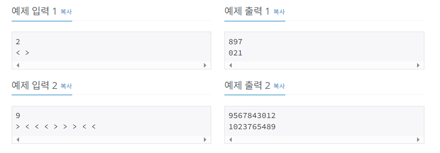 여러분은 제시된 부등호 관계를 만족하는 k+1 자리의 최대, 최소 정수를 첫째 줄과 둘째 줄에 각각 출력해야 한다. 단 아래 예(1)과 같이 첫 자리가 0인 경우도 정수에 포함되어야 한다. 모든 입력에 답은 항상 존재하며 출력 정수는 하나의 문자열이 되도록 해야 한다.